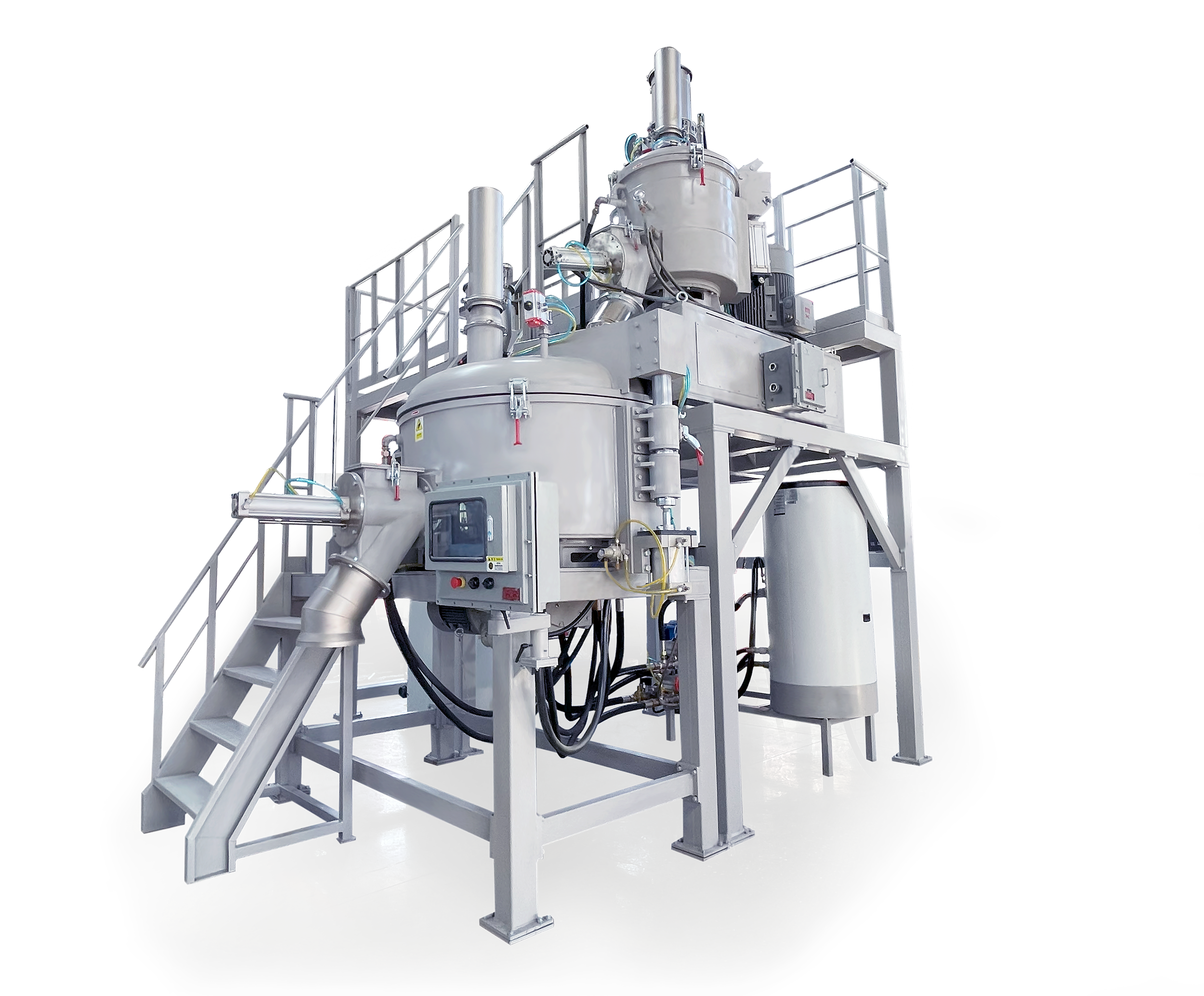 該設備混料罐采用惰性氣體吹洗,配有防爆系統和雙重密封系統,邦定罐和冷卻罐配有夾層水冷系統,罐體采用大圓弧設計,折流板的角度和高低可任意調節,自潔性好,升溫均勻。