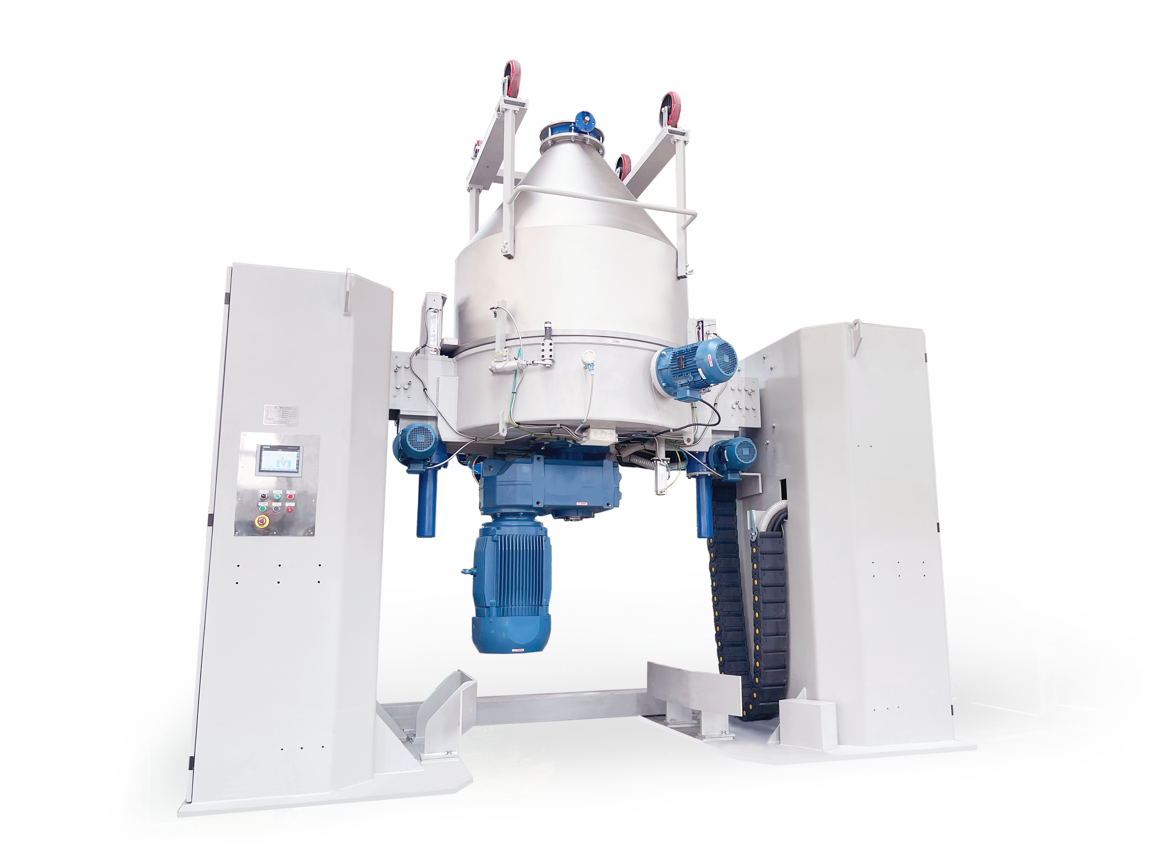 LCM系列混合機采用可移動式料斗,適用于各種粉末及粒狀材料的混合攪拌。裝有待混合原料的料斗推到工位后,自動控制系統將其提升,與攪拌頭(可配置冷卻水套)安全鎖定。料斗與攪拌頭一起翻轉 180 度,在攪拌槳和破碎輪的作用下,完成對物料的攪拌和混合?;旌贤瓿珊?,料斗自動回到原工位,與攪拌頭分離。